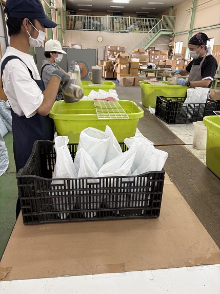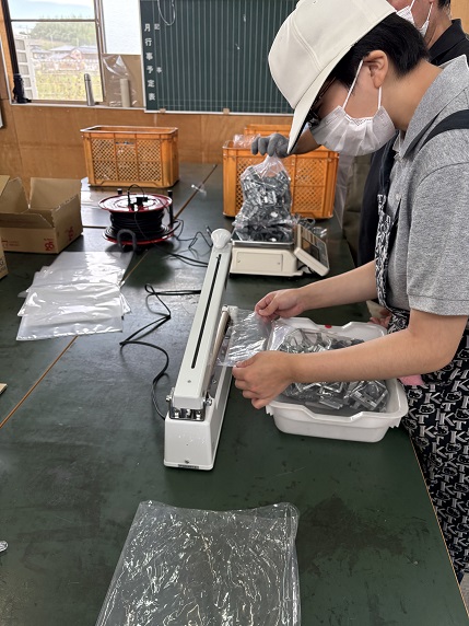 また、新たに「フック作業」もスタートしました。建築用の留め金具を袋に分けて入れ、シーラーで封をする作業です。初めて取り組む作業ですが、皆さんが積極的に声を掛け合い、より効率的な方法を試行しながら意欲的に進めています。