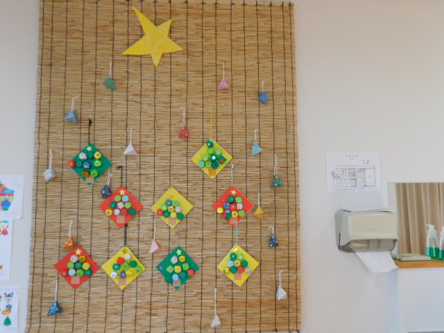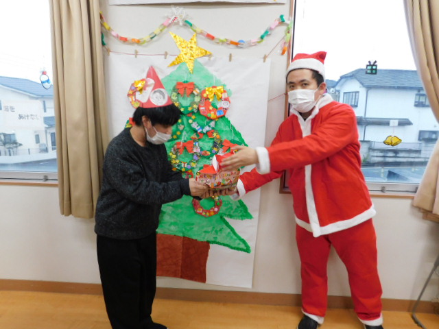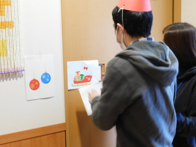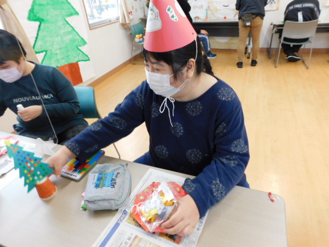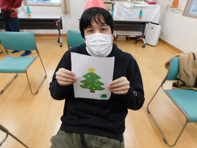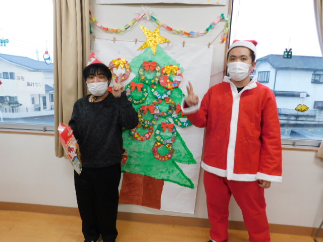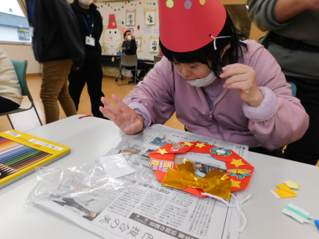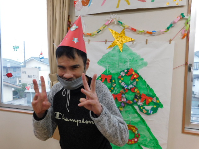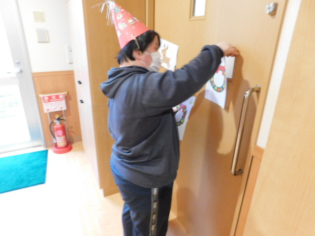 日中活動時間を利用してクリスマス会にかぶる帽子や、室内を彩る装飾の数々は利用者の方々に作成していただきました。