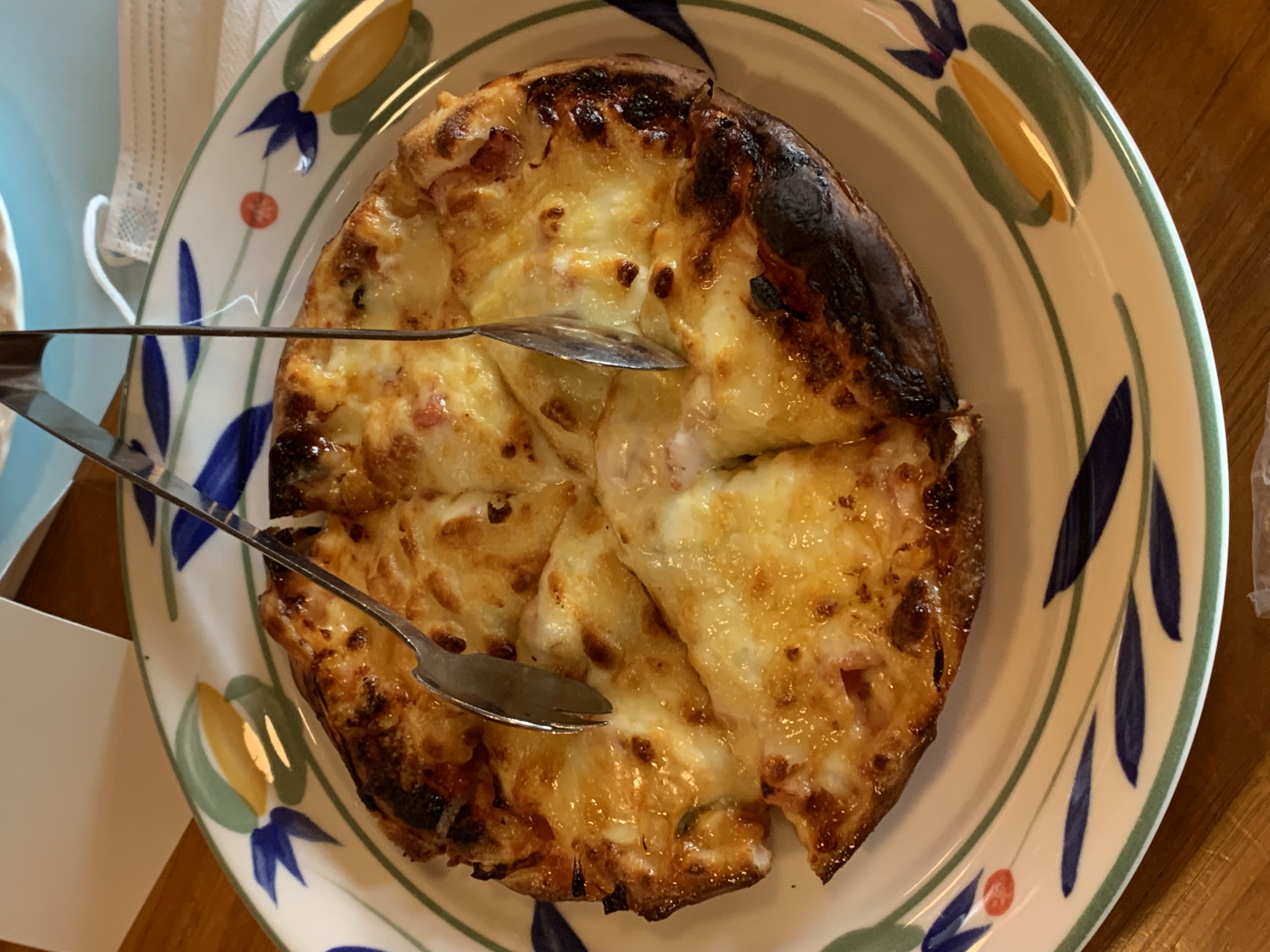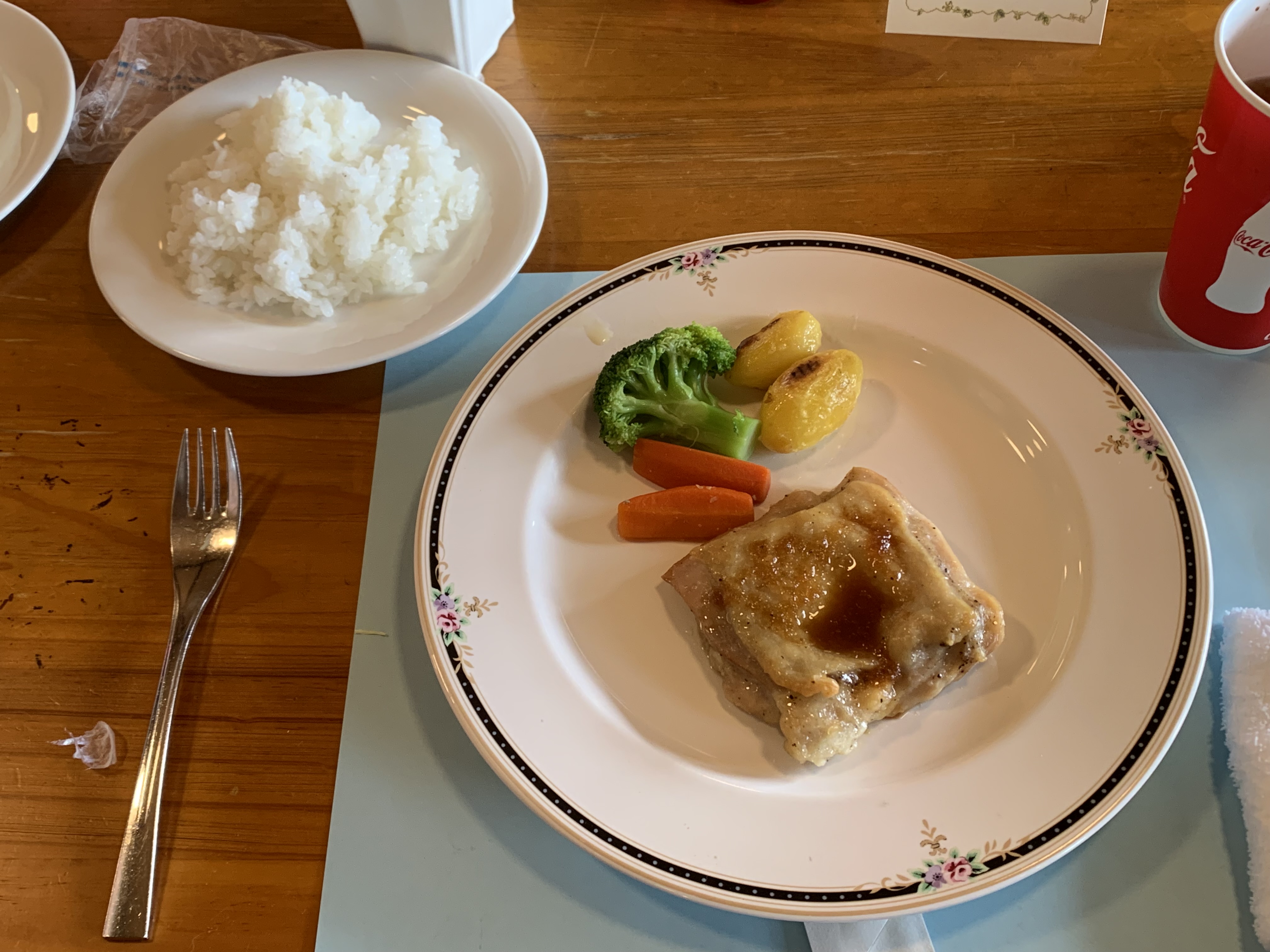 食事は、サラダにフライドポテト、ミートスパゲッティ、八王子農園特製ピッツァ、チキンステーキ。