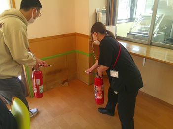 最後に、職員が消火器の使い方を教えていただき無事に訓練は終了です。